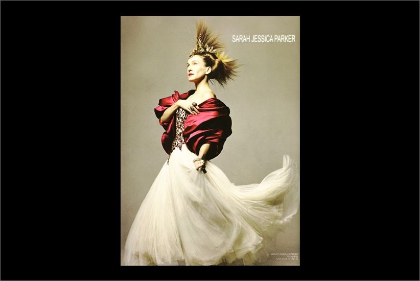 Sarah Jessica Parker pays tribute to the late Alexander McQueen by wearing a look from his fall 2008 collection complemented with Hari Jewels Diamond and Ruby Ring